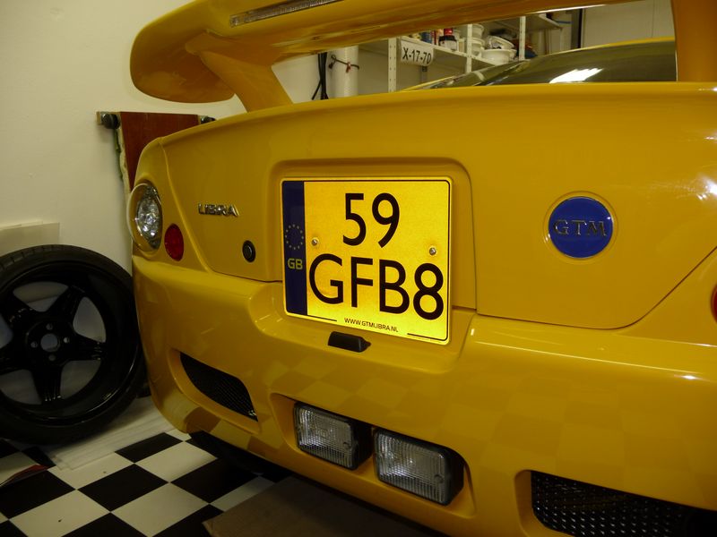 | 24 juni Even een inhaalslag maken... Mijn Nederlandse kenteken is inmiddels binnen. Voor de achterkant van de auto heb ik in Engeland een kentekenplaat besteld in de Engelse vierkante maat, die afwijkt van de Nederlandse vierkante plaat. De Engelse plaat past perfect in de daarvoor bedoelde ruimte.