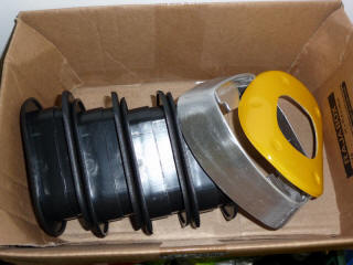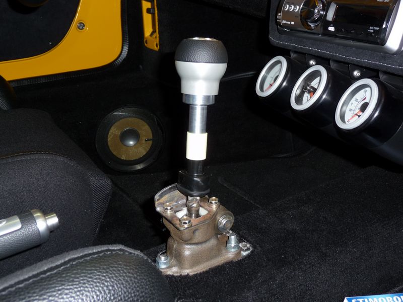 In voorbereiding op het opnieuw bekleden van mijn stoelen en wat ander restwerk laat ik de ring onderaan de pookhoes en de doorvoeren voor de gordels geel spuiten. De originele pookring gaat mee voor de kleur.